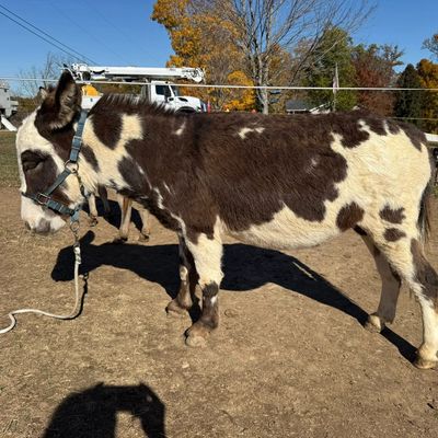 Annie came to us in 2024 with her half sister Mae. She lives up to her name of being sassy and is often times zooming around the pasture and harassing her sister. She is what is called a "no lights points" (NLP) Donkey which means she lacks the typical light-colored muzzle, eye rings, belly and inner legs and instead has dark coloring in those areas. This is a rare, recessive trait. We can't wait to see her babies.